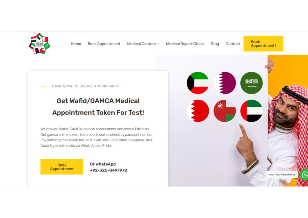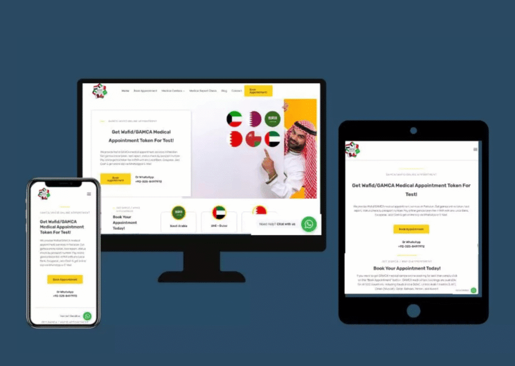 Marqetric designed and developed GAMCA Medical Pakistan (gamcamedical.pk), a complete online solution for booking GAMCA / WAFID medical appointments across Pakistan. The platform helps individuals traveling to GCC countries (Saudi Arabia, UAE, Qatar, Oman, etc.) to easily book, pay, and receive their medical appointment slips online.